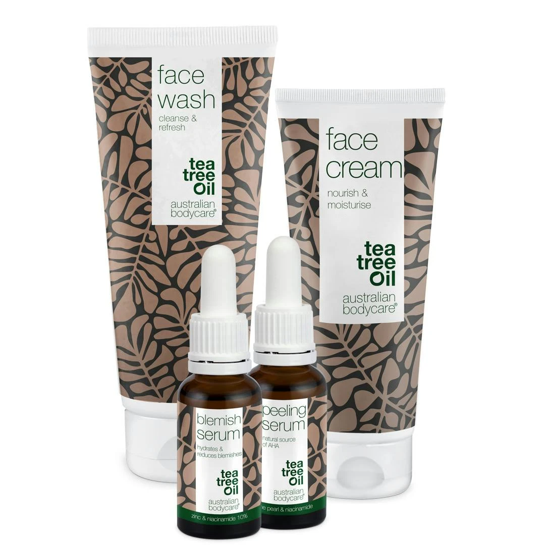 Paket med fyra ansiktsprodukter för daglig rengöring och vård. Produkterna säkrar en jämn och slät hudton och kan användas för daglig vård av pigmentfläckar, orenheter och finnar.