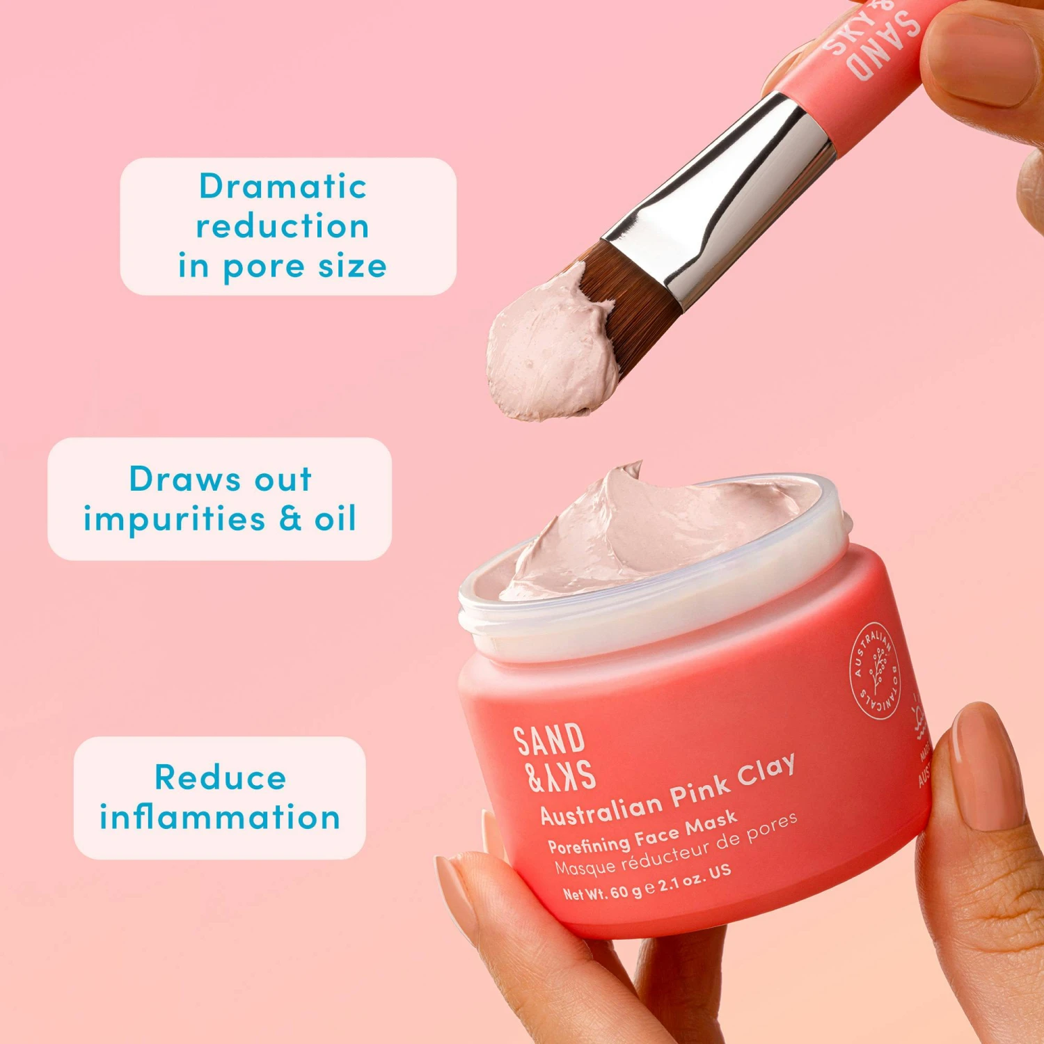 Australian Pink Clay Porefining Face Mask från Sand & Sky är den ultimata lösningen för att avgifta och ljusa upp din hud på bara 10 minuter. Med en extremt effektiv 4-i-1-formel stramar denna ansiktsmask upp porerna, återupplivar en tråkig hudton och ökar din utstrålning omedelbart. Och för att göra det ännu enklare att applicera masken har vi inkluderat en praktisk applikationsborste.