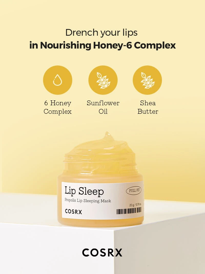 Med Full Fit Propolis Lip Sleeping Mask kan du säga adjö till torra och spruckna läppar och välkomna mjukhet och välbefinnande. Skäm bort dina läppar och ge dem den kärlek de förtjänar med denna fantastiska läppbalsam från Cosrx.