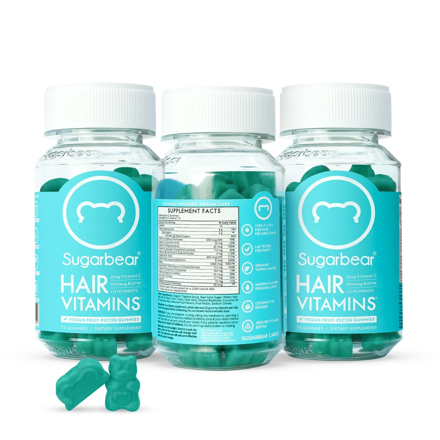 Inuti SugarBearHair: Gummibjörnarna innehåller en kombination av: Vitamin A, Vitamin C, Vitamin D, Vitamin E, Vitamin B-6, Folsyra, Vitamin B-12, Biotin, Pantotensyra, Jod, Zink, Kolin och Inositol. Folsyra, Pantotensyra, Jod, Zink