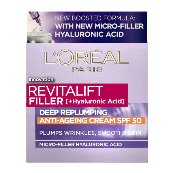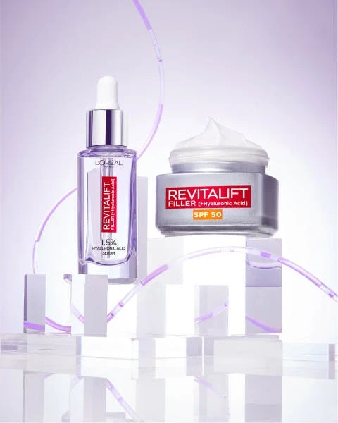 Makro-hyaluronsyra: tillför fukt på hudytan. • Mikro-hyaluronsyra: fyller ut de översta hudlagren med fukt. • Nya micro-filler hyaluronsyra: för en intensiv verkan på rynkor.