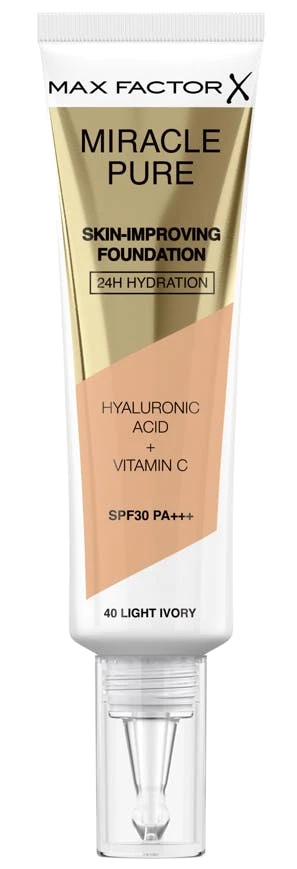 Mirakel kan ske! Max Factor presenterar Miracle Pure Foundation 40 Light Ivory – ett kliniskt dokumenterat mirakel som inte bara fungerar som en foundation, utan också vårdar din hud på bara en minut. Med denna foundation kan du uppnå förbättrad lyster, fasthet, elasticitet, densitet och smidighet på din hud och teint med bara en enda droppe.