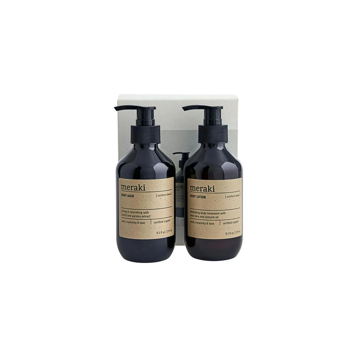 Att ge bort en present ger både dig och mottagaren glädje, oavsett tillfälle. Överraska en närstående med denna omtänksamma presentlåda från Meraki. Den består av en kroppstvätt och en kroppslotion med den populära Northern Dawn-doften. Båda är certifierat ekologiska. Kroppstvätten ger näring och återfuktar din hud med ekologiska extrakt från morot och persilja. Avsluta din rutin med kroppslotion som gör huden mjukare samtidigt som den återfuktar med mandelolja och kakaosmör. Northern Dawn är en uppfriskande doft av färska apelsiner, cederträ och söt balsamico.