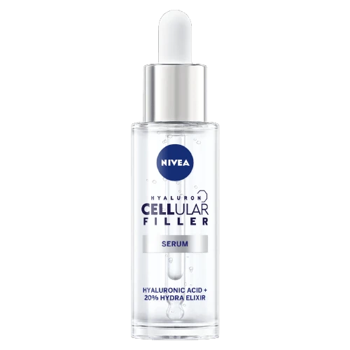Nivea Hyaluron Cellular Filler Anti-Age Plumping Serum är ett avancerat anti-age-serum som bekämpar synliga ålderstecken. Serumet innehåller hyaluronsyra som intensivt återfuktar huden och minskar synligheten av rynkor och fina linjer. Den lätta och snabbabsorberande formulan lämnar huden slätare, fastare och mer ungdomlig. Få en förnyad och strålande hud med detta plumpande serum.