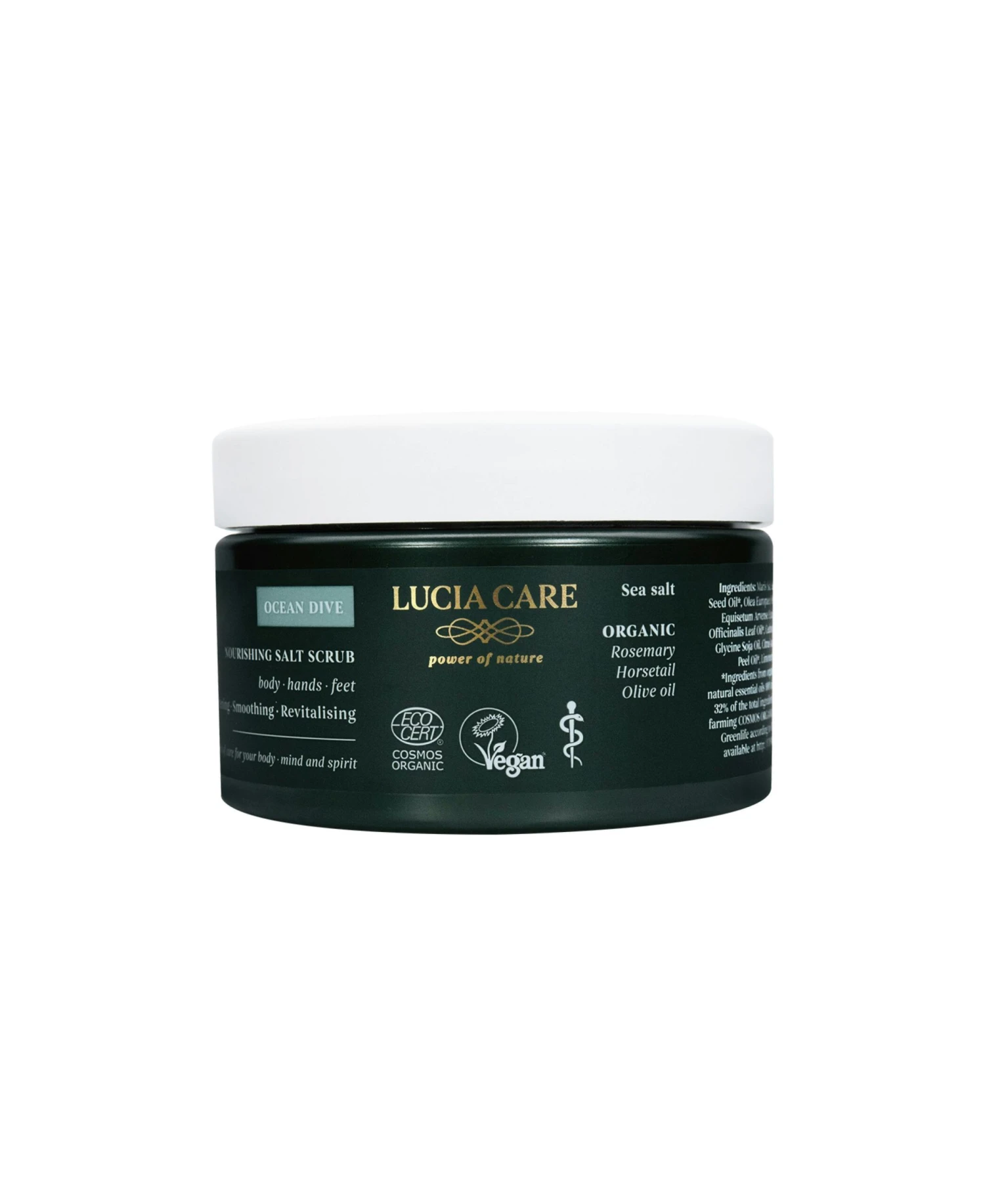 Nourishing Salt Scrub är komponerad av ekologiska vegetabiliska oljor. Oljan absorberas snabbt och djupt i huden och tillför fukt, näring, elasticitet och glow. Havssaltet rengör på djupet, exfolierar och avlägsnar döda hudceller. Efterlämnar huden silkesmjuk och len med en hälsosam glöd. Vi människor är gjorda för att vara i salt. Våra kroppsvätskor, som tårar och intracellulära vätskor, är mättade på salt. Vi behöver mätta vår hud på salt. Havssalt och kiselhaltig fräken bidrar till att hämma den förökning av hudceller som kan uppstå vid torr och fjällande hud.