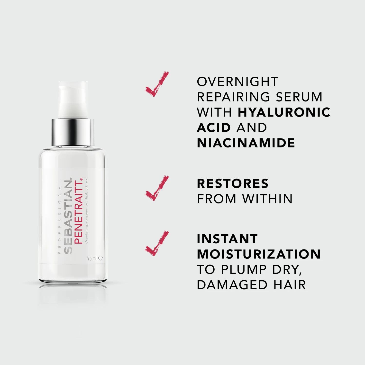 PENETRAITT reparerande serum med hyaluronsyra och niacinamid tränger djupt in i håret och hjälper till att reparera medan du sover. Vakna upp med ett hår som både känns och ser mjukt, lent och återfuktat ut, redo för obegränsad styling.