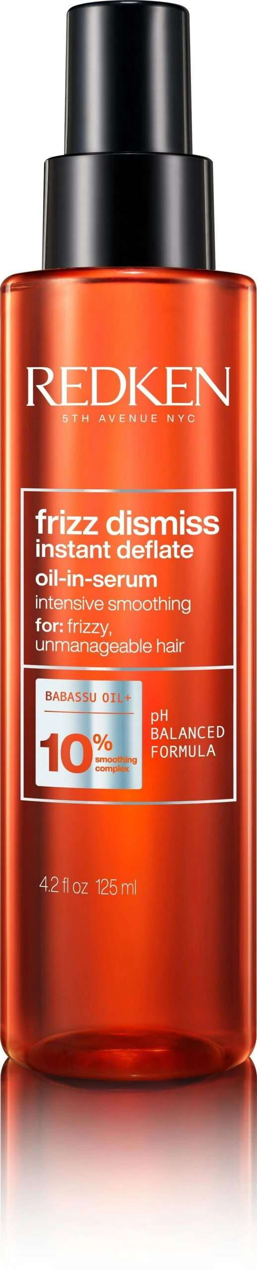 Få kontroll över spretiga hårstrån och friss med denna utslätande hårolja/hårserum från Redken. Redken Frizz Dismiss Oil-In-Serum är utvecklat för att passa alla hårtyper, men är särskilt effektiv i frissigt och tovigt hår. Produkten innehåller nämligen babassuolja och sojabönor som ger dig maximal kontroll över håret samtidigt som håret efterlämnas silkeslent och följsamt under hela 24 timmar. Applicera en liten mängd Frizz Dismiss Oil-In-Serum i handflatorna och fördela sedan håroljan i håret med fokus på topparna. Avsluta med att styla ditt hår som du brukar. Innehåller 125 ml.