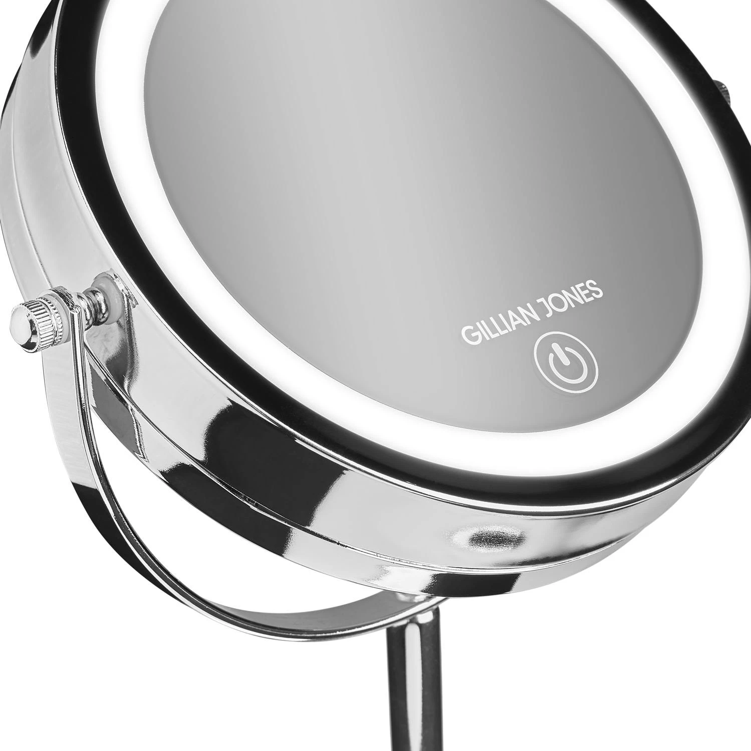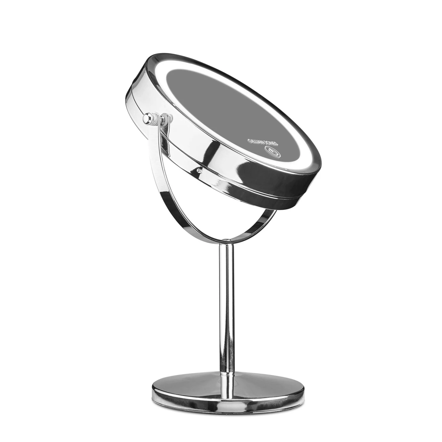 Gillian Jones superpopulär bordsspegel med kraftfullt LED-ljus och touchfunktion. Spegeln är gjord av silver-krom och äkta glas. Ena sidan har 1:1 förstoring, den andra x10 förstoring. Själva spegelhuvudet kan rotera 360 grader och det kraftfulla LED-ljuset kan tändas och släckas med ett fingertryck på spegelns framsida. Spegeln använder 3x AAA-batterier och är 17 cm i diameter och 32 cm hög. Förutom silverkrom finns spegeln även i roséguld, mattsvart och gun smoke