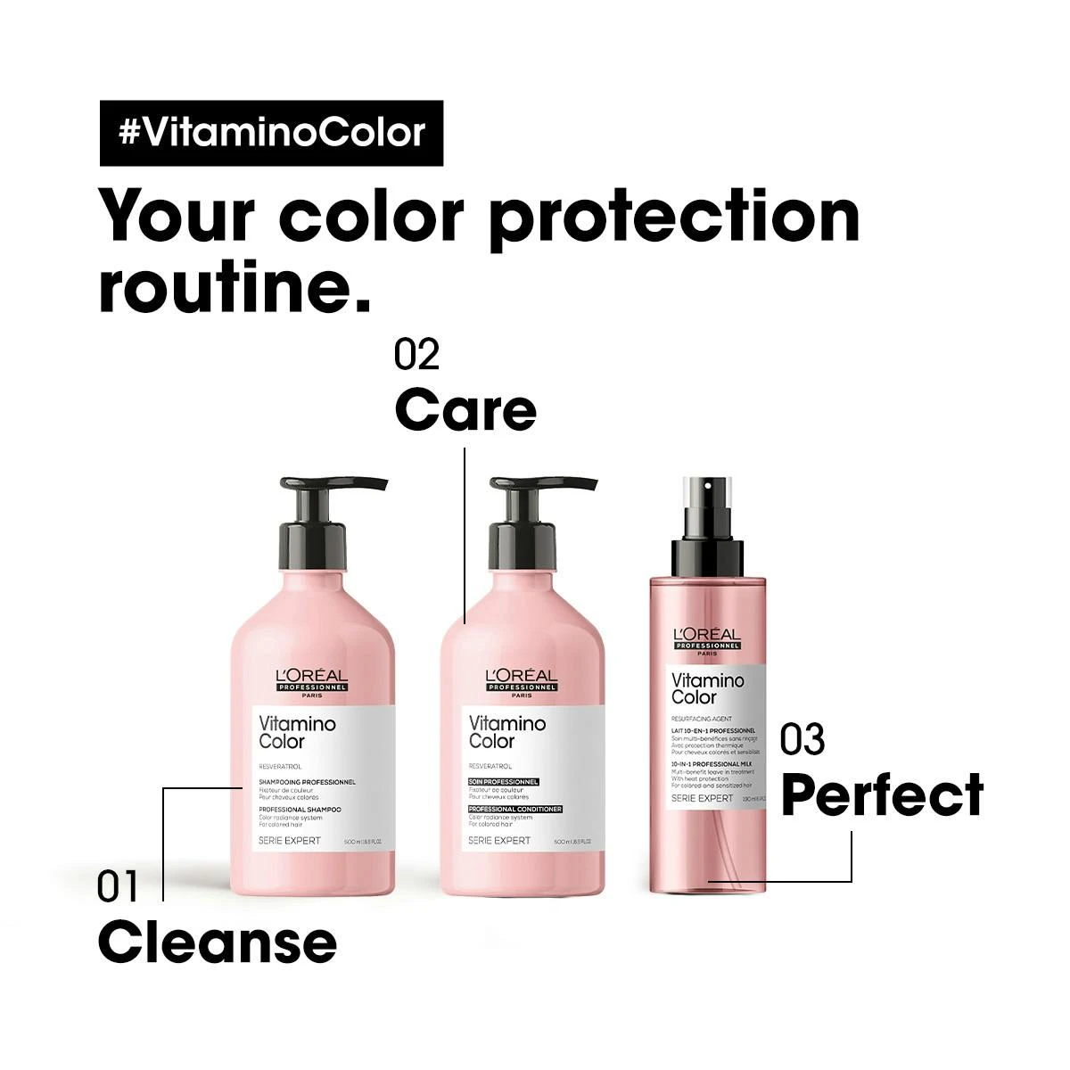 Professionellt färgbevarande balsam för färgat hår. Formulan, som är berikad med Resveratrol, skyddar färgen från att blekna i upp till 8 veckor, och skyddar hårfibern från skador för ett perfekt strålande resultat*. Håret blir omedelbart närat, mjukare, mer glansfullt och skyddat från hårroten till topparna. L’Oréal Professionnel Serie Expert verkar för mindre påverkan på miljön. Omdesignad förpackning med 95% återvunnen plast & lättare förpackning.